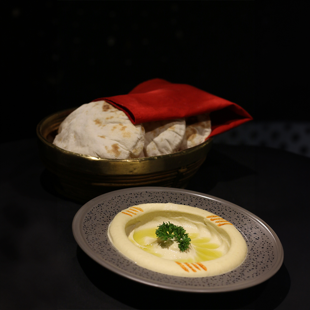 Mashed chickpeas mixed with sesame seed paste and a dash of lemon juice topped with olive oil and spring onion, tomato, mashed garlic served with bread.