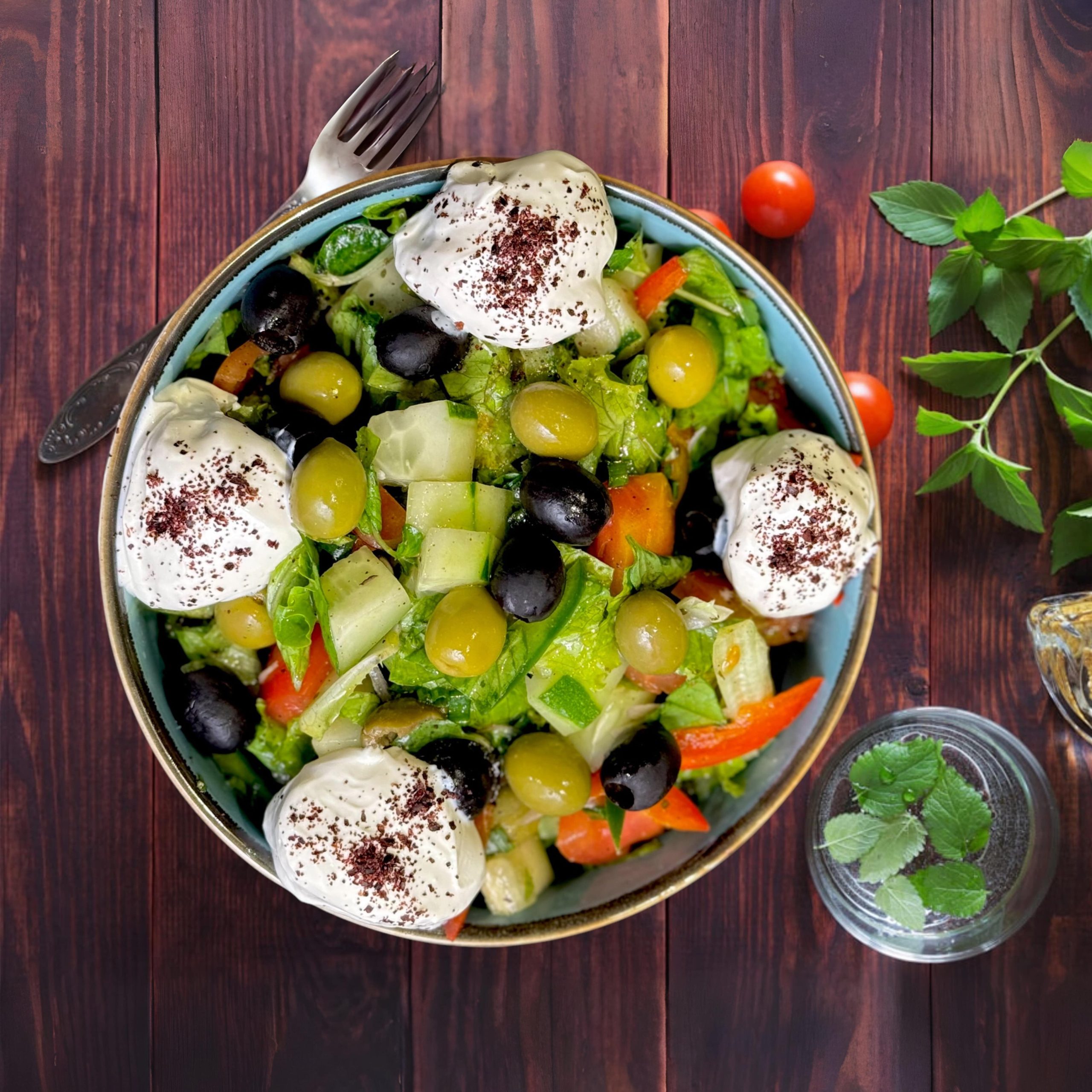 A refreshing mixture of tomato, cucumber, lettuce, capsicum, mint leaves and spring onion, served with special sumac dressing.